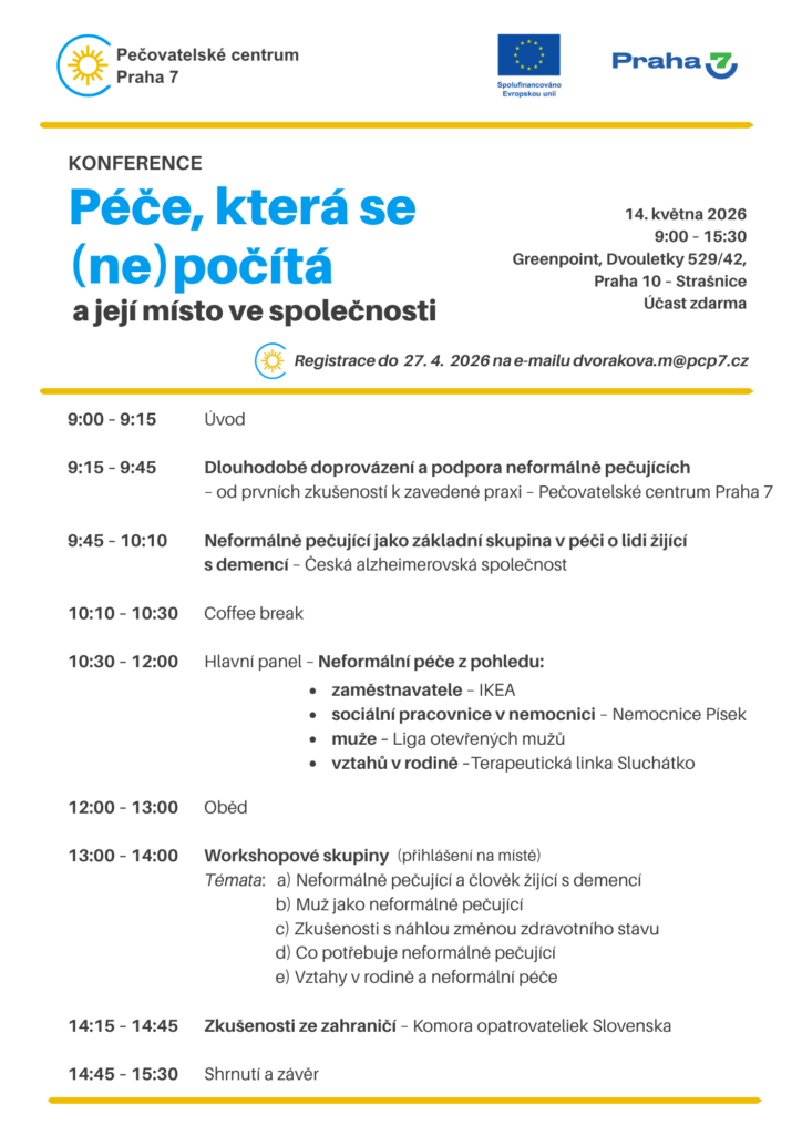 Za podpory Městské části Praha 7 a Evropské unie pořádáme 14. května 2026 odbornou konferenci s názvem „Péče, která se (ne)počítá a její místo ve společnosti“, která se zaměří na roli neformálně pečujících a jejich podporu v systému sociálních a zdravotních služeb.